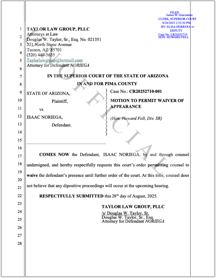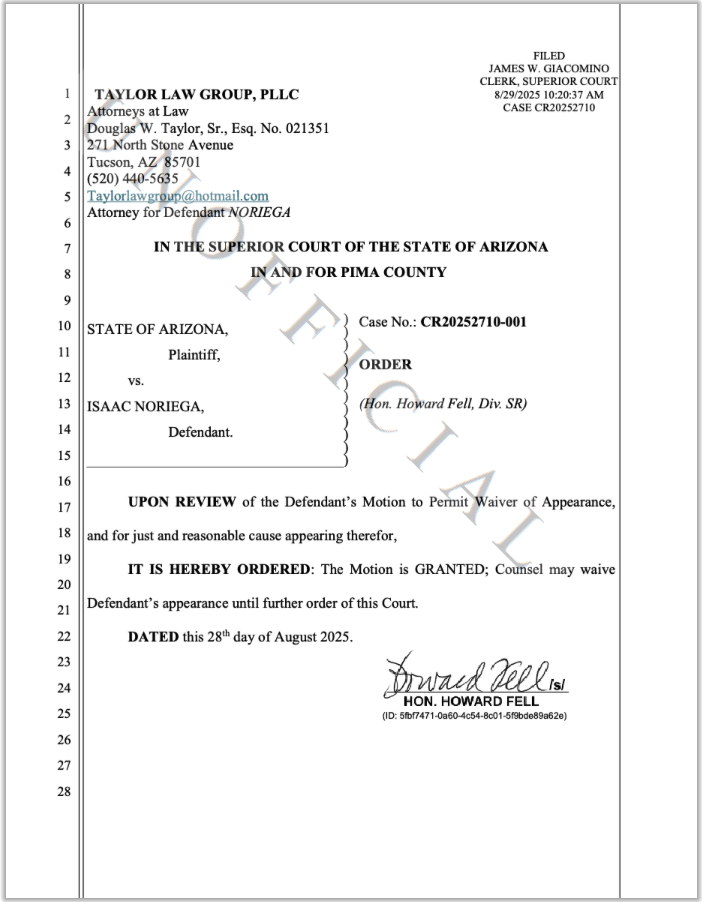 On September 4, 2025, 9:00-10:00AM, Pastor Isaac Noriega was not present in court. His absence was permitted after Judge Howard Fell approved a prior motion from his attorney, Douglas W. Taylor, allowing him to waive personal appearance.